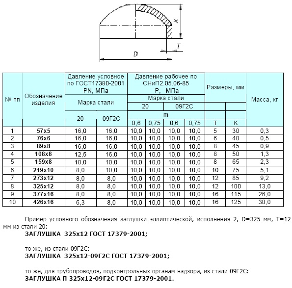 Заглушки эллиптические (англ. «elliptical cap»)— детали трубопровода, предназначенные для полного перекрытия тока рабочей среды в трубопроводе, тип присоединения - приварка.