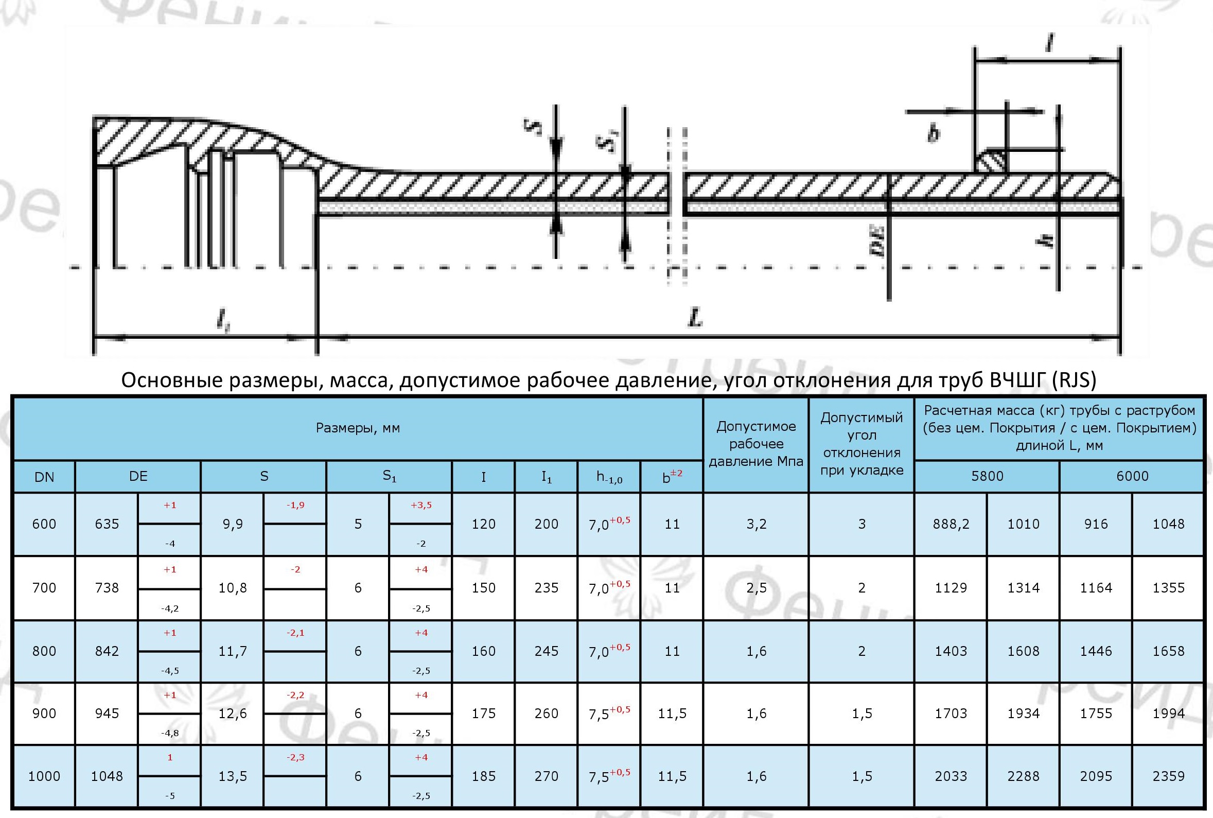 Раструбно-замковое («RJS») соединение под резиновое уплотнение в виде кольца предназначено для трубопроводов DN от 600 до 1000 мм с рабочим давлением от 1,6 до 3,2 МПа. Трубы под соединение «RJS» укомплектовываются резиновыми уплотнениями типа «Tyton» и стопорами, которые, для предотвращения разъединения, фиксируются металлической лентой.