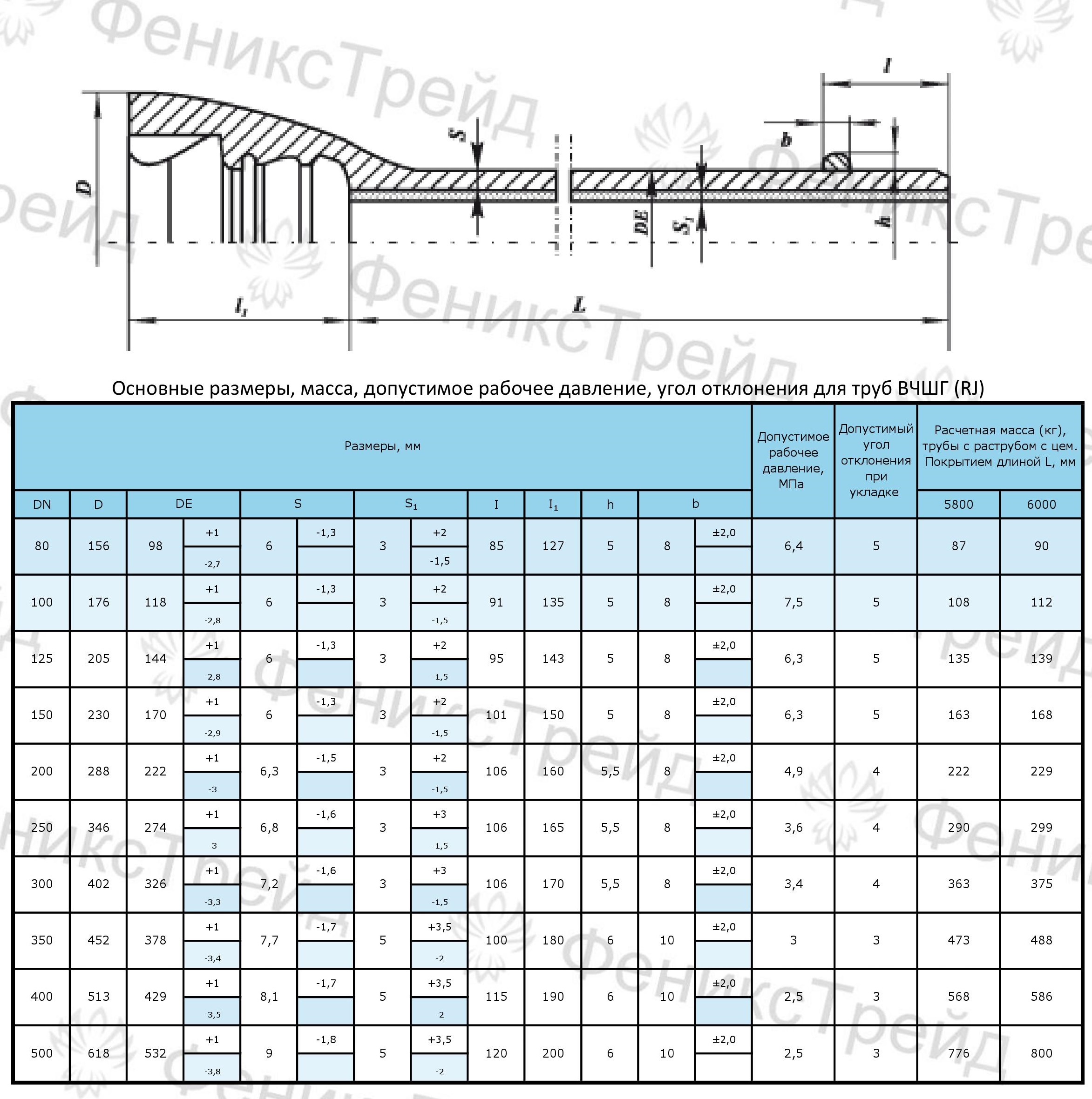 Раструбно-замковое («RJS») соединение под резиновое уплотнение в виде кольца предназначено для трубопроводов DN от 600 до 1000 мм с рабочим давлением от 1,6 до 3,2 МПа. Трубы под соединение «RJS» укомплектовываются резиновыми уплотнениями типа «Tyton» и стопорами, которые, для предотвращения разъединения, фиксируются металлической лентой.