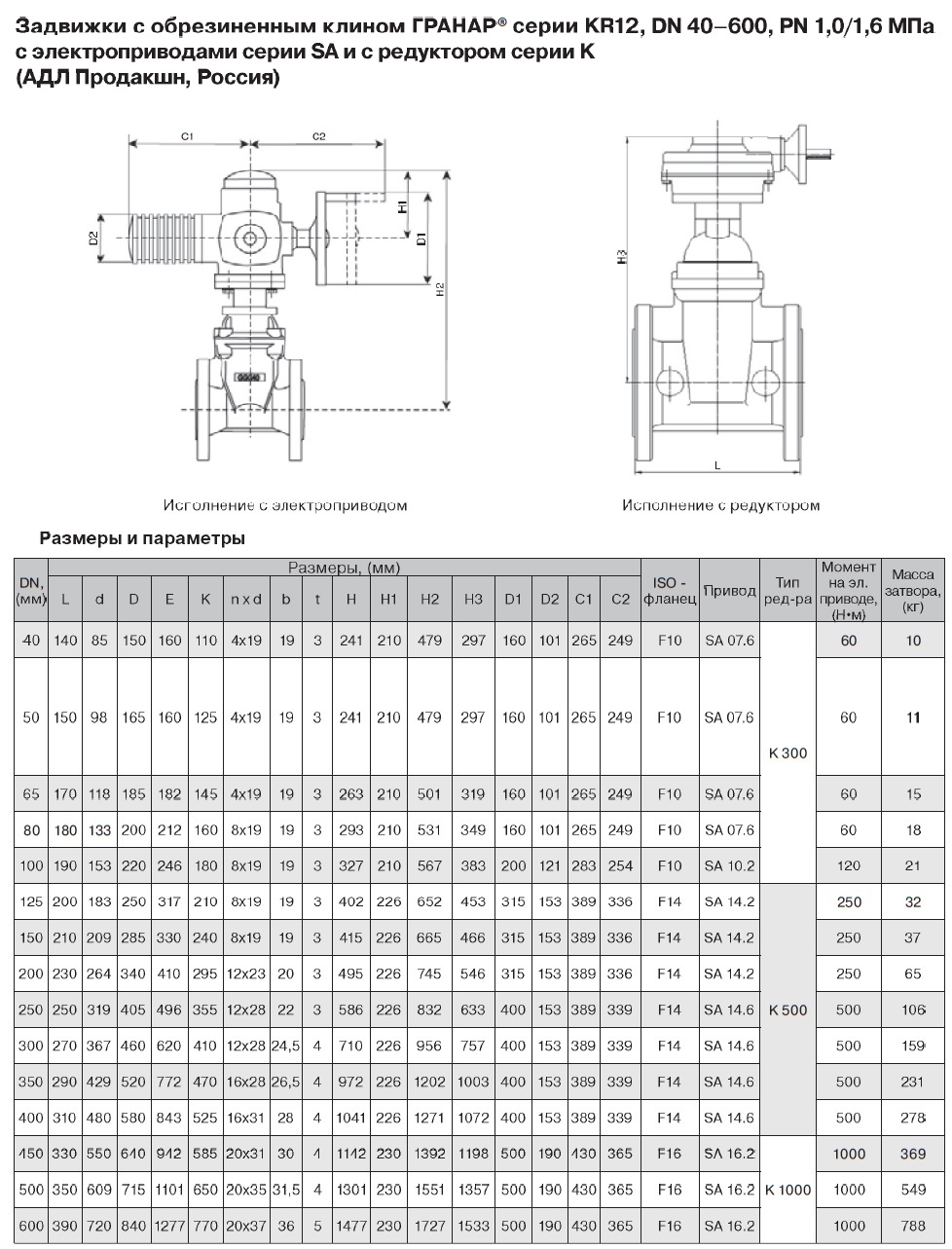 | Полное наименование | Задвижка чугунная фланцевая клиновая ГРАНАР KR12 с электроприводом AUMA |