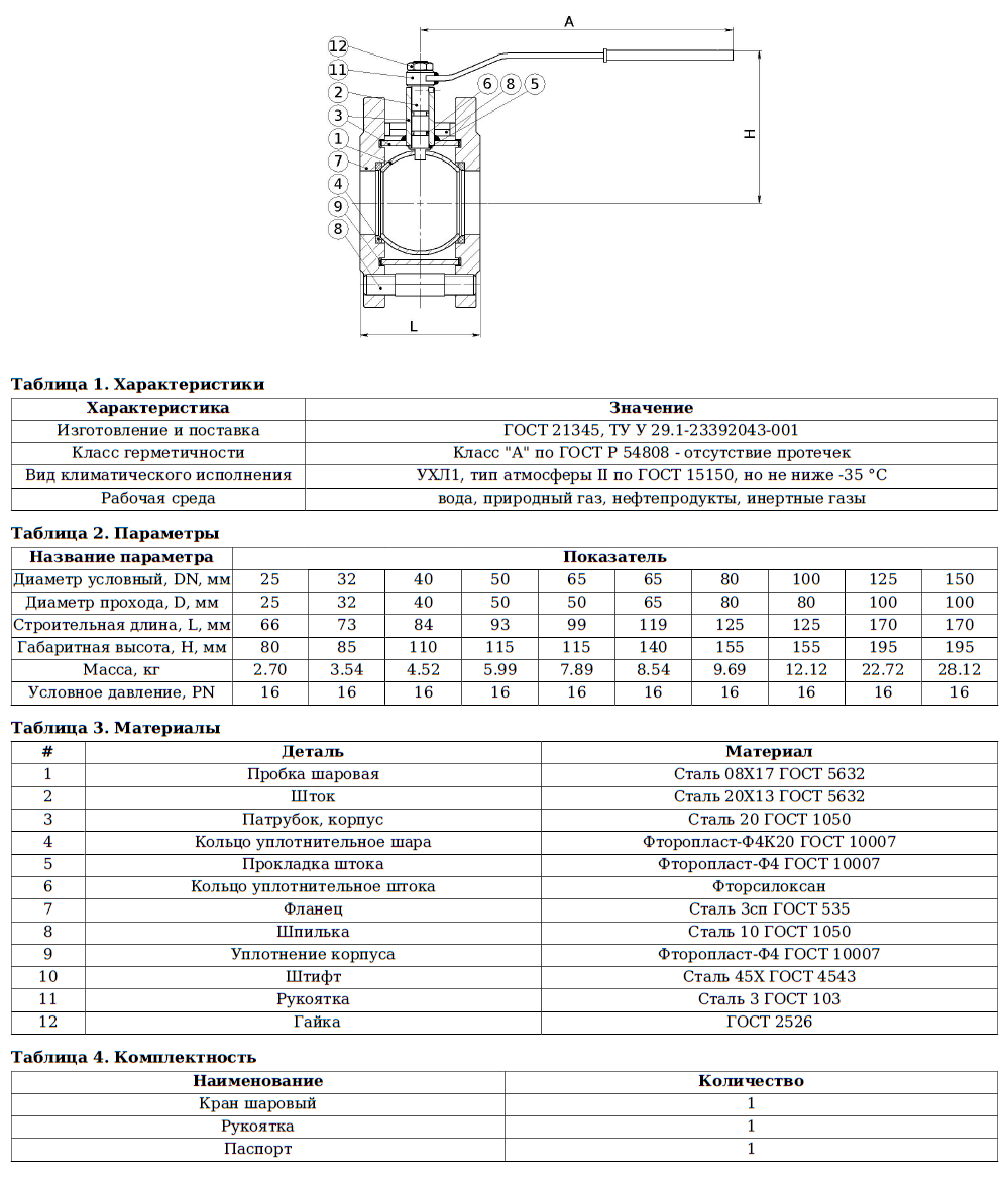 | Класс герметичности: | Класс "А" по ГОСТ Р 54808 - отсутствие протечек |